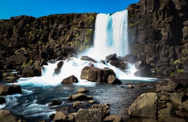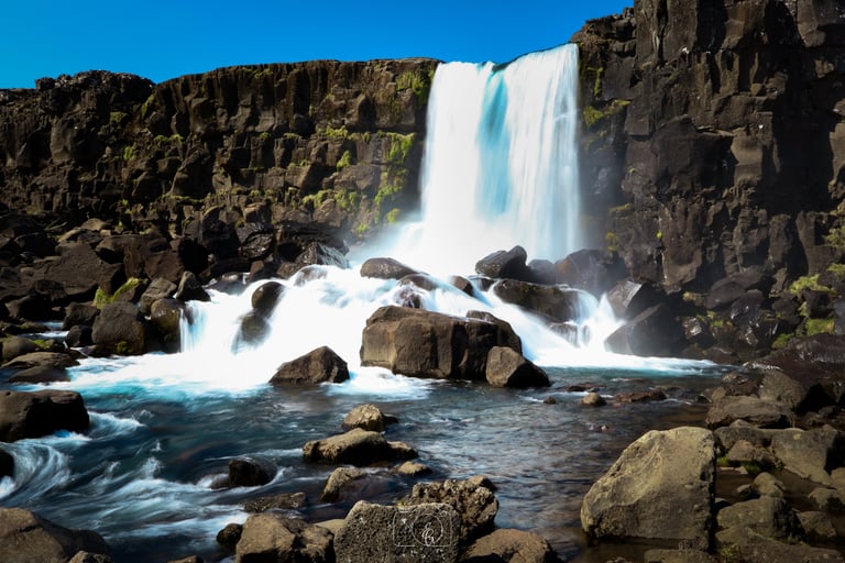 Een klein stukje verder zie je al een kleine waterval die je warm maakt voor de Öxarárfoss, een waterval van meer dan tien meter hoog. De Öxarárfoss zit prachtig in de kloof en geeft een indrukwekkend gezicht. Met een lange sluitertijd krijgt de waterval een dromerig effect. Omdat het water heel hard stroomt, hoef je niet eens een hele lange sluitertijd te gebruiken.
