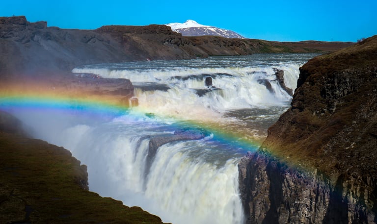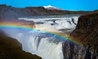 Als je klaar bent om weer door te gaan, is je volgende en tevens laatste stop de waterval Gullfoss. Dit is volgens velen één van de mooiste watervallen van IJsland. Gullfoss betekent de 'gouden waterval', naar de kleur die ze krijgt in het avondlicht. Het water van de gletsjerrivier Hvítá stort hier in totaal 31 meter naar beneden in de Hvítárgljúfur - de onderliggende kloof. De rivier heeft een 3-4 km lange kloof uitgesleten in het plateau in de afgelopen 10.000 jaar en gaat tot wel 70 meter diep.