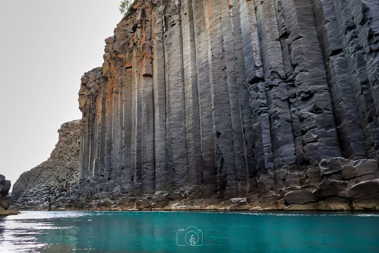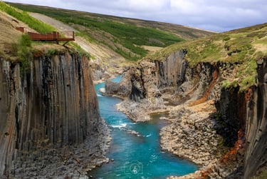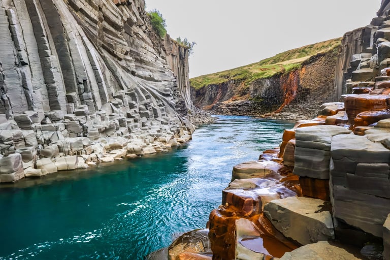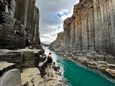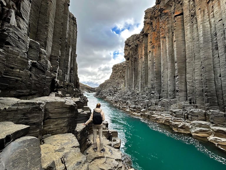 Next up is Stuðlagil Canyon, one of Iceland’s most famous geological wonders. The name translates roughly to “Basalt Column Canyon” — and once you see it, you’ll understand why. The walk to the canyon takes about 30 minutes and is relatively flat, making it the perfect follow-up after the Hengifoss hike. When the canyon finally comes into view, prepare to be amazed: bright blue glacial water flows between towering, dark basalt columns that seem almost otherworldly.