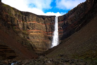 Your first stop is Hengifoss, Iceland’s third-highest waterfall, standing tall at 128 meters. The striking red clay and black basalt layers on the surrounding cliffs create a breathtaking natural contrast. Before you can get close to the falls, you’ll need to hike up a gravel path — around 190 meters in elevation gain. It’s a bit of a climb, but once you reach the top, that dramatic view of Hengifoss makes every step worth it.