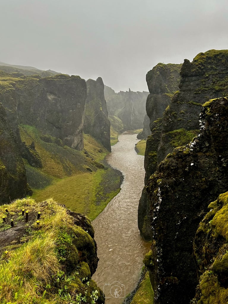 A little further down the road, the landscape dramatically shifts. You’ll reach Fjaðrárgljúfur Canyon, carved out by the Fjaðrá River over thousands of years. The hike along the canyon rim is about 2 kilometers (roughly an hour) and offers breathtaking views of the winding emerald gorge. This spot is unmissable on any South Iceland itinerary.